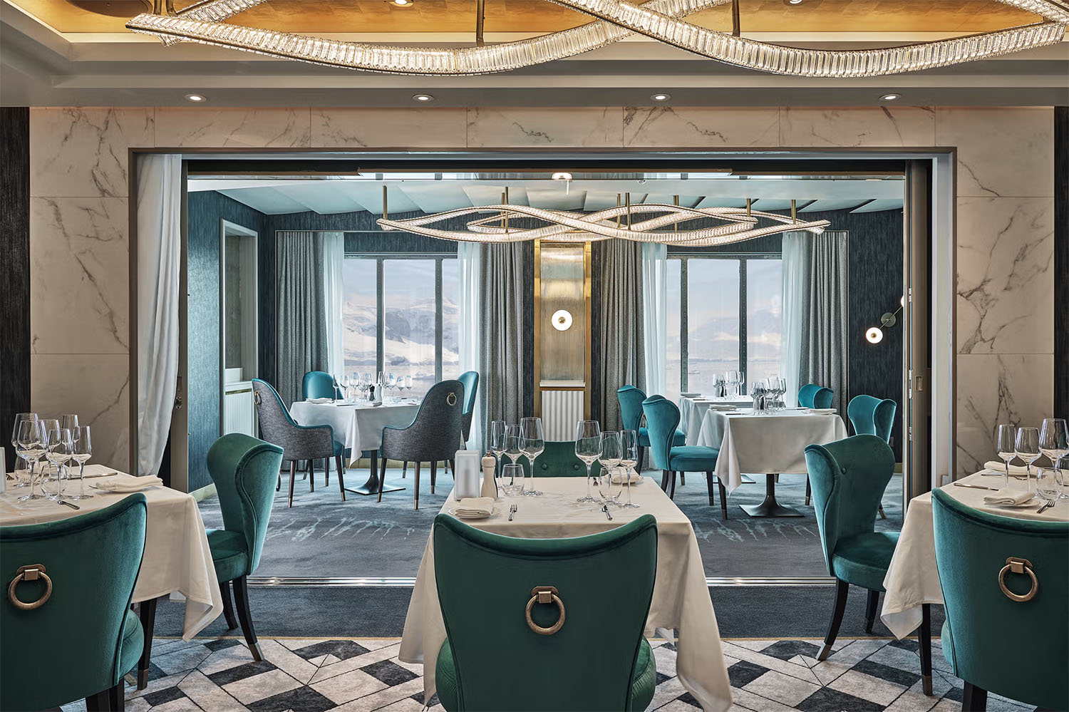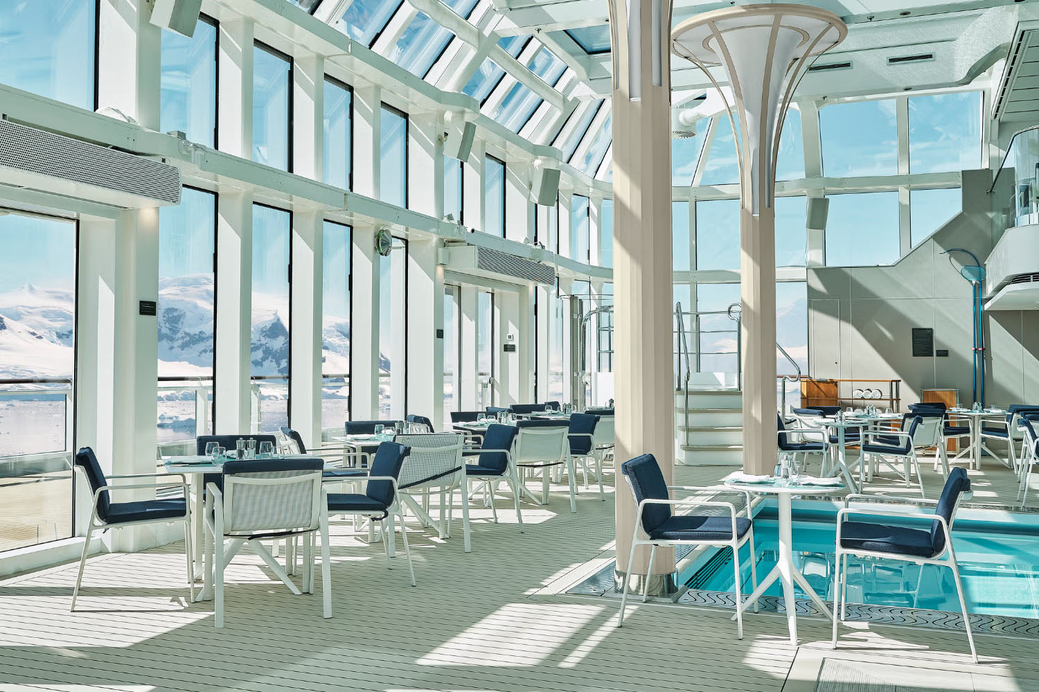 作为极致探险的载体,银海奋进号配备了包括 14 艘冲锋舟(Zodiac)与皮划艇在内的顶级装备,并拥有一支由海洋学家、历史学家及自然专家组成的精英探险团队。借助船上独有的远程云台摄像系统,宾客甚至能在 5 公里外清晰捕捉野生动物的动态。在南极与北极的征途中,每一次登陆与巡游都是一场深度的自然对话。而在探险归来后,船上多达 4 间的高级餐厅——包括法式餐厅 La Dame 与拥有玻璃穹顶的景观泳池区,将用米其林级的美食与极致的休憩时光,完美抚慰探险者的身心。