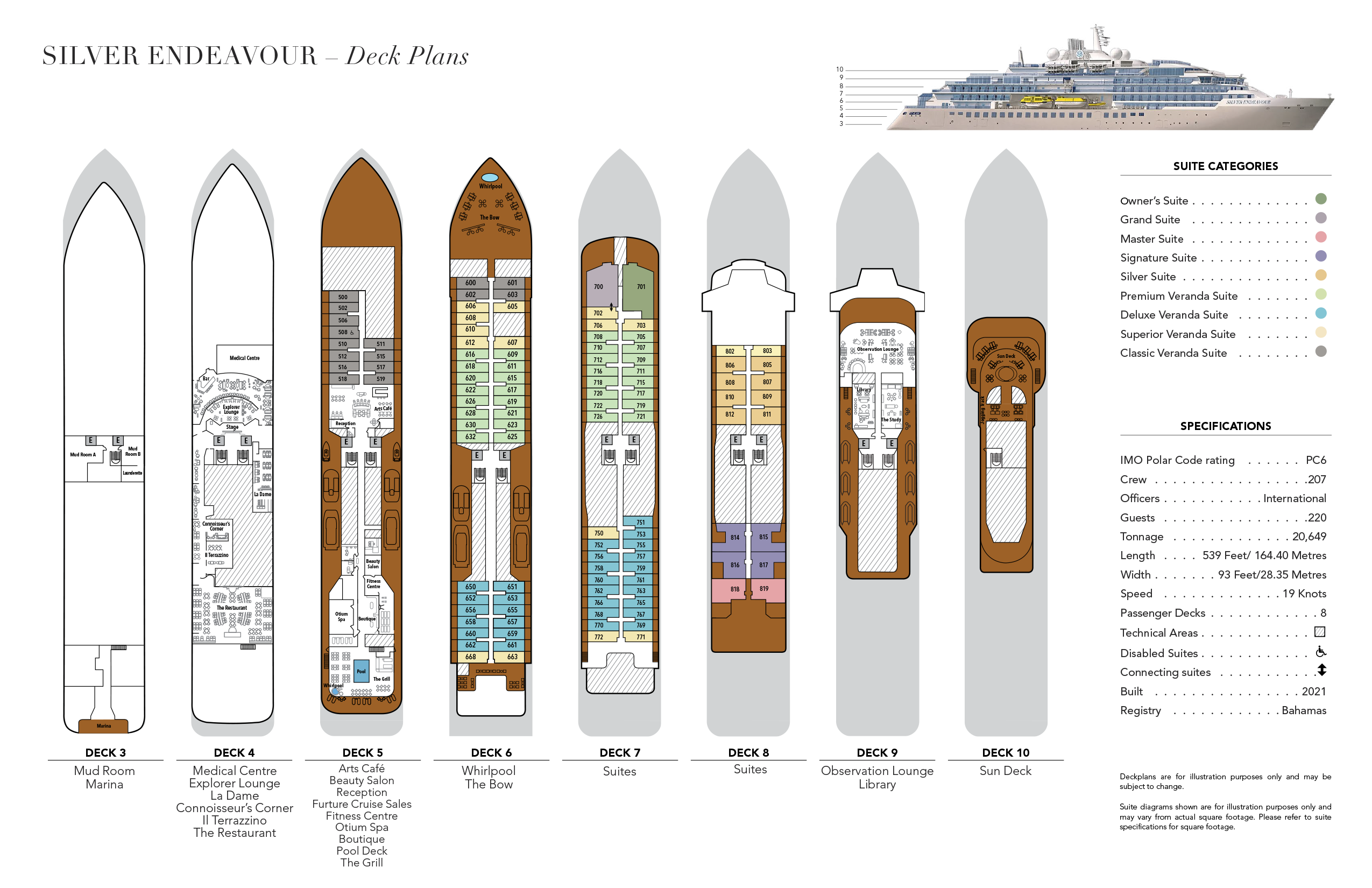 银海奋进号(Silver Endeavour)是银海邮轮船队中最新、最先进的极地探险旗舰,被誉为“世界上最豪华的探险邮轮”。作为专为极地探索而生的 PC6 级冰级邮轮,它于 2021 年完工,代表了尖端航行技术与顶级奢华体验的巅峰结合。它不仅刷新了银海邮轮的硬件标准,更凭借先进的导航科技重新定义了高端探险旅行的边界,被视为旨在超越极限、带领宾客深入地球尽头的标杆之作。