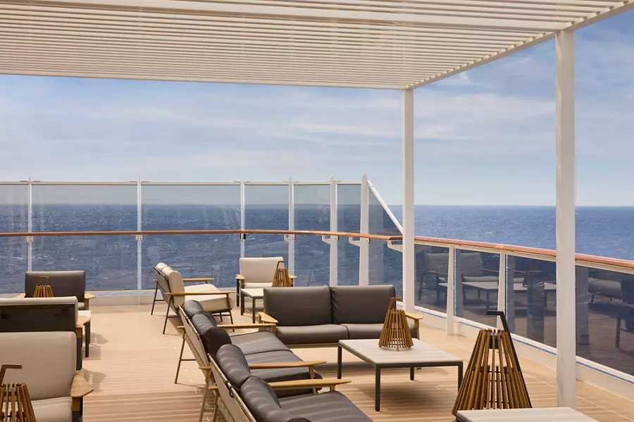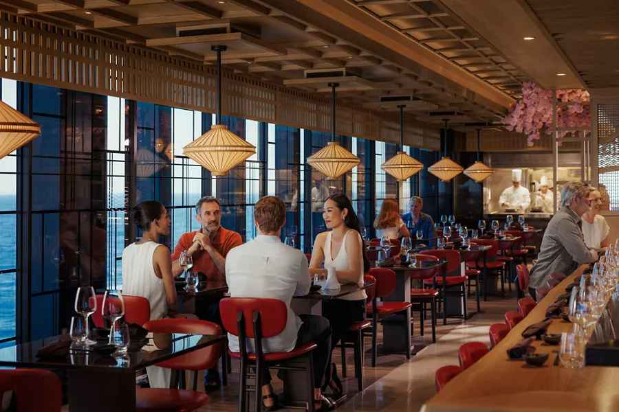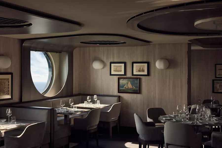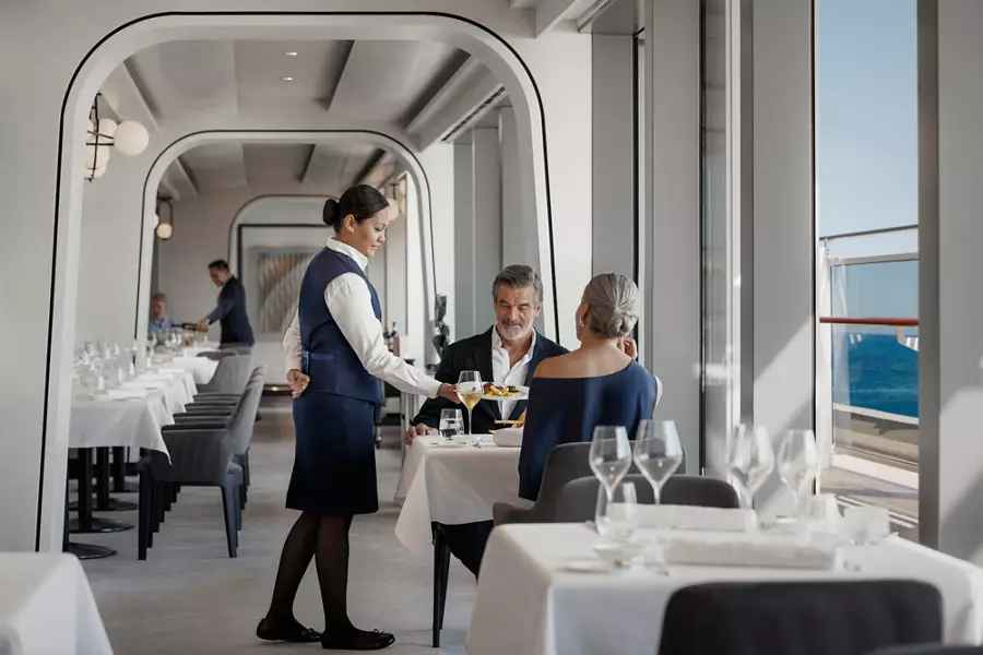 公共空间设计极具辨识度,船上拥有超过2,500㎡的户外甲板空间及多处无边际泳池,将海景视野最大化呈现。整体氛围摒弃传统邮轮的娱乐喧闹,更强调静谧、松弛与精致社交。餐饮方面,EXPLORA I 提供6大主题餐厅与多间高端酒廊,从地中海料理、泛亚洲风味到精致法餐,呈现全球化高端餐饮水准。