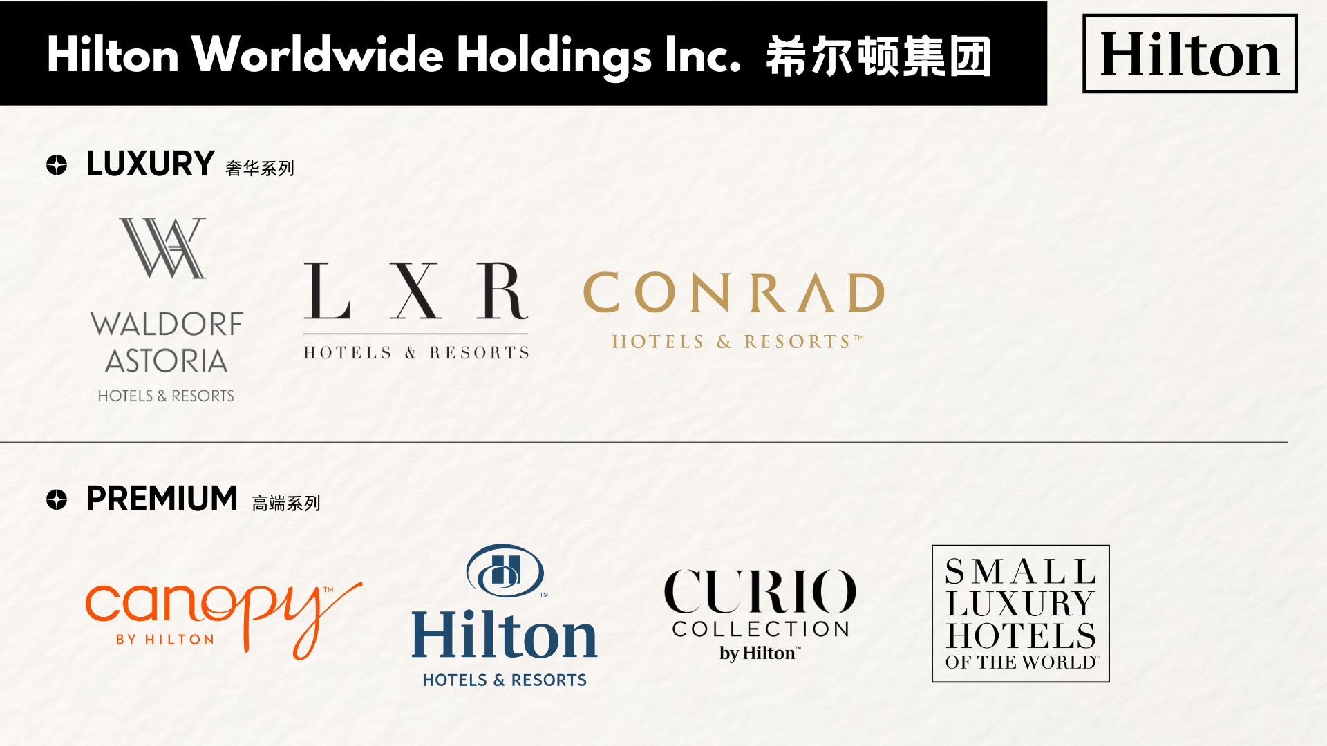 在高级与生活方式领域,希尔顿拥有 Hilton Hotels & Resorts(希尔顿酒店)、DoubleTree by Hilton(希尔顿逸林)、Curio Collection by Hilton 与 Tapestry Collection 等多元品牌组合。希尔顿酒店以国际化标准、商务便捷与全球覆盖形成集团核心;逸林酒店以温暖贴心的服务理念受到商务与家庭旅客青睐;Curio 以精选独立精品酒店组成的高端集合品牌,为旅客提供具有在地个性的现代化体验;Tapestry 则结合精品设计与高端舒适,为旅客呈现富有故事性的居停感受。