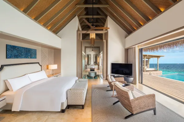 酒店共119套全别墅设计,从可直通海滩的泳池别墅,到需乘船抵达、悬于碧波之上的空中别墅,皆完美诠释了现代奢华与自然景致的融合。其标志性的华尔道夫庄园,面积逾1500平方米,配备私人厨师与无边泳池,重新定义了极致的入住体验。