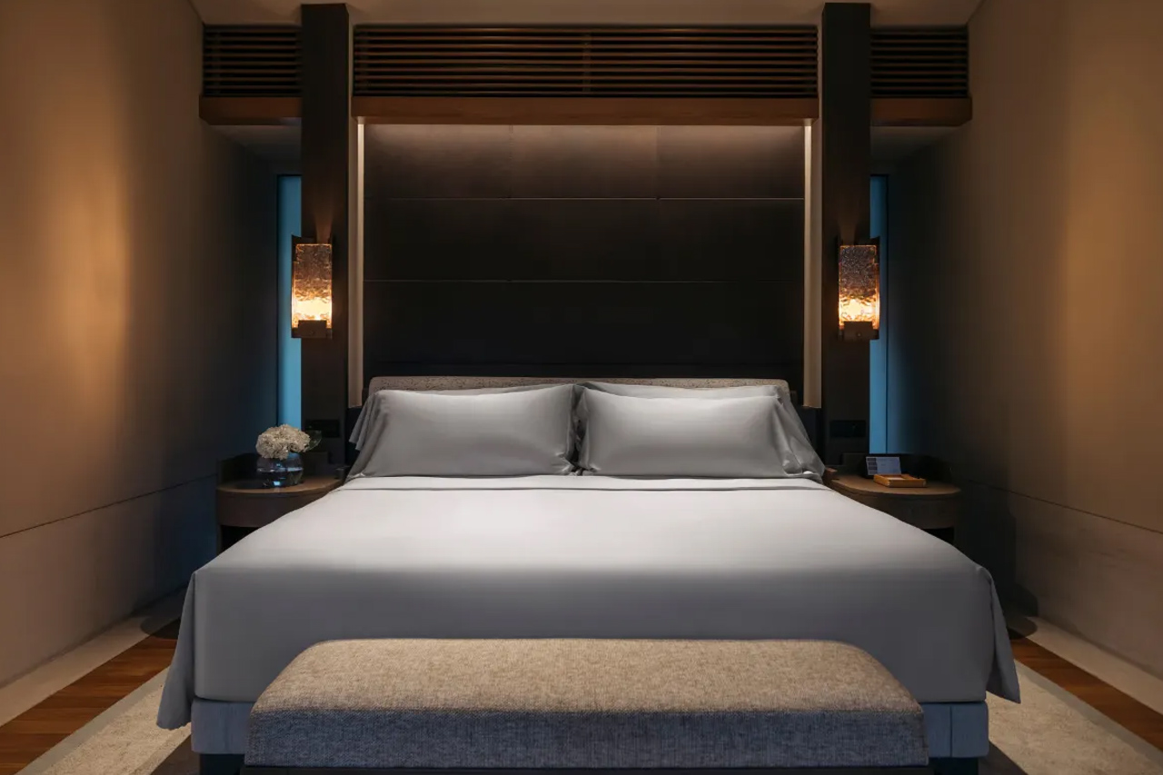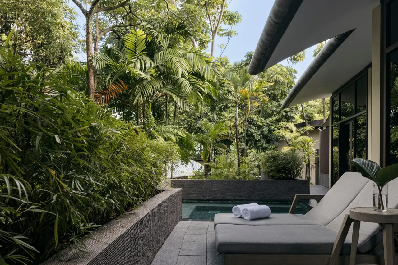 酒店建筑融合了英式殖民遗产与现代建筑美学:原有两栋19世纪Tanah Merah殖民建筑与现代设计巧妙结合,营造出独特的空间氛围。112间客房、套房、别墅及庄园由知名设计师精心打造,许多房型设有观海露台、私人泳池或大型按摩浴缸,空间布局尊贵舒适,私密性极高。