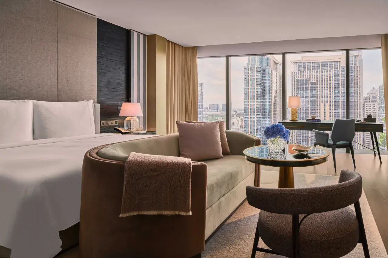曼谷瑰丽酒店(Rosewood Bangkok)坐落于湄南河畔核心地段,毗邻郑王庙与大皇宫,是瑰丽集团在东南亚的标杆之作。酒店以“当代泰式优雅”为灵魂,将传统泰丝纹理、兰那王朝建筑元素与现代艺术巧妙融合,尽显低调奢华。