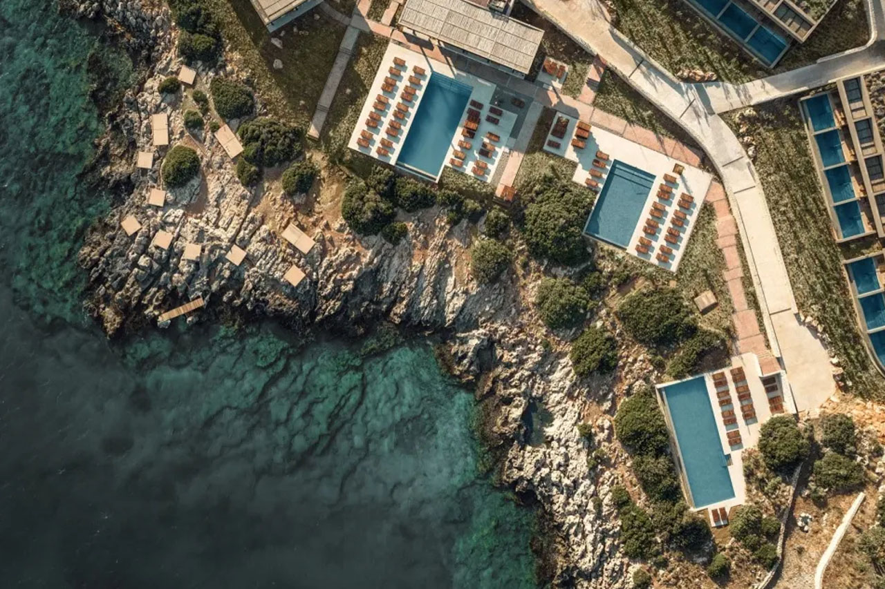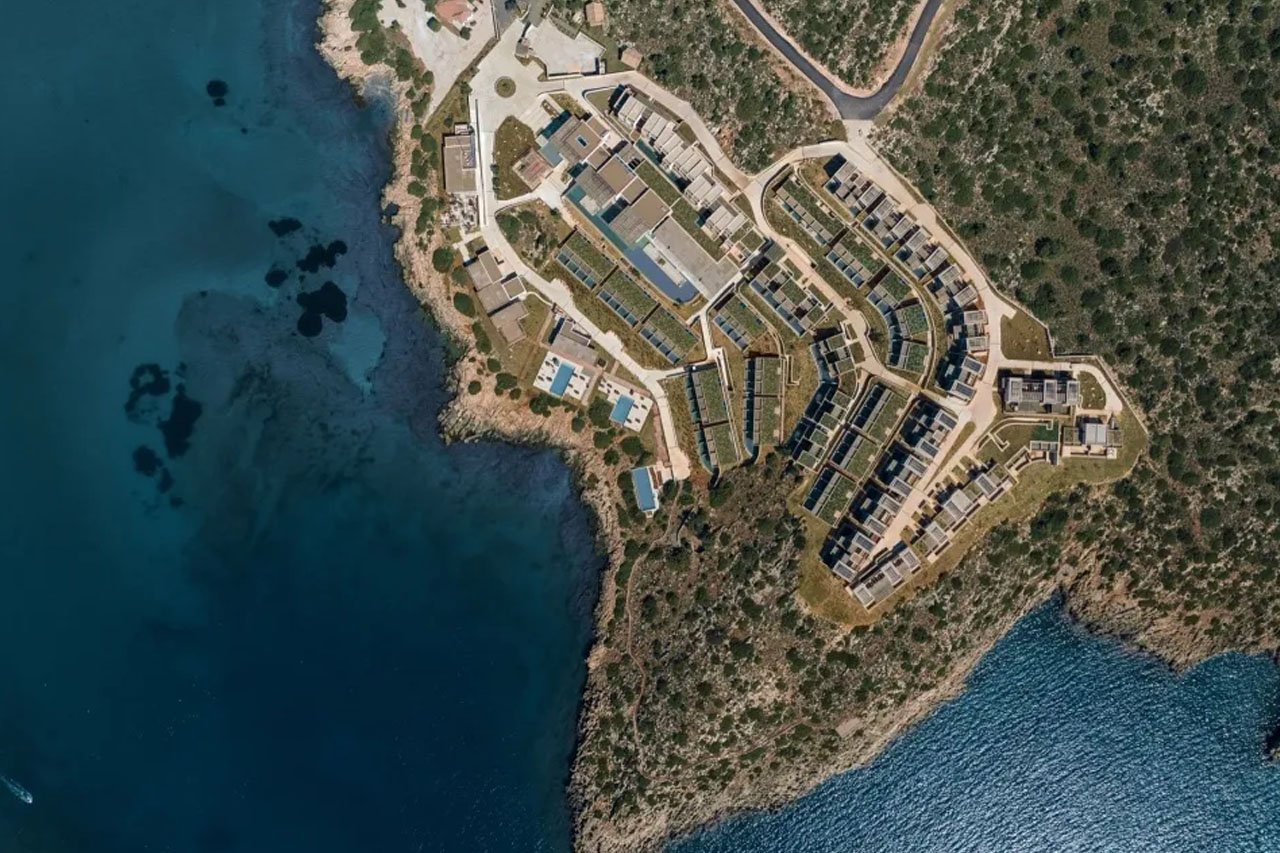 酒店由 Block722 设计事务所操刀,坐落于克里特岛 Akra Pelegri 的岩石山坡之上,俯瞰苏达湾。