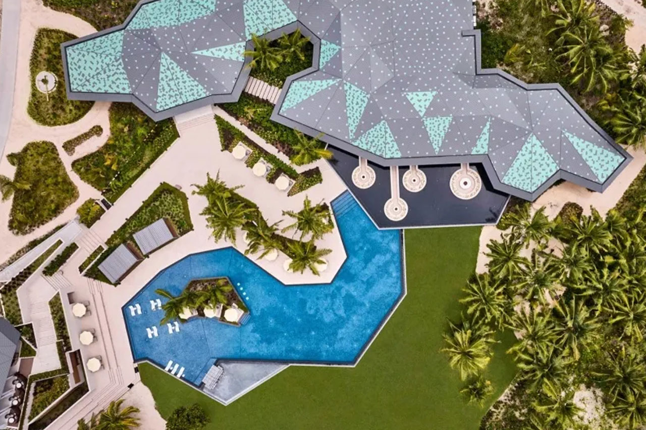 由 Eco-id Architects 设计,整体建筑与室内灵感源自岛上玳瑁海龟壳的色彩与纹理。