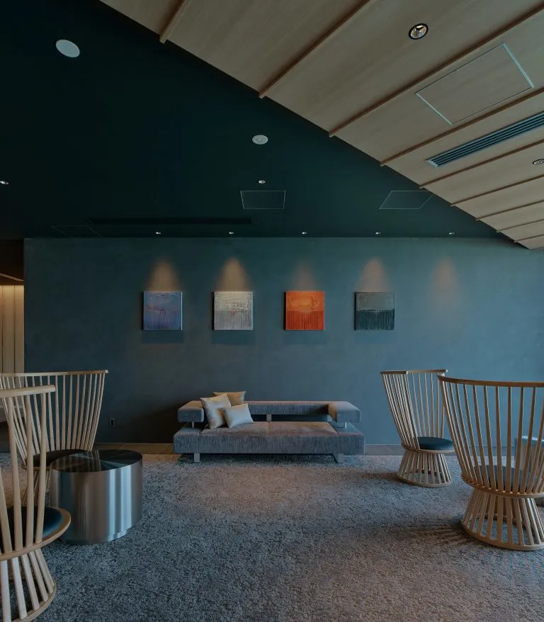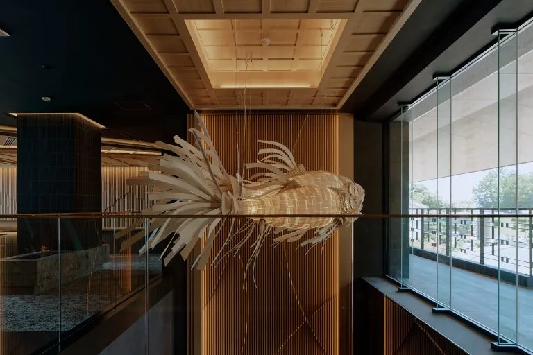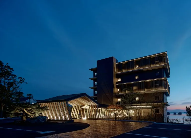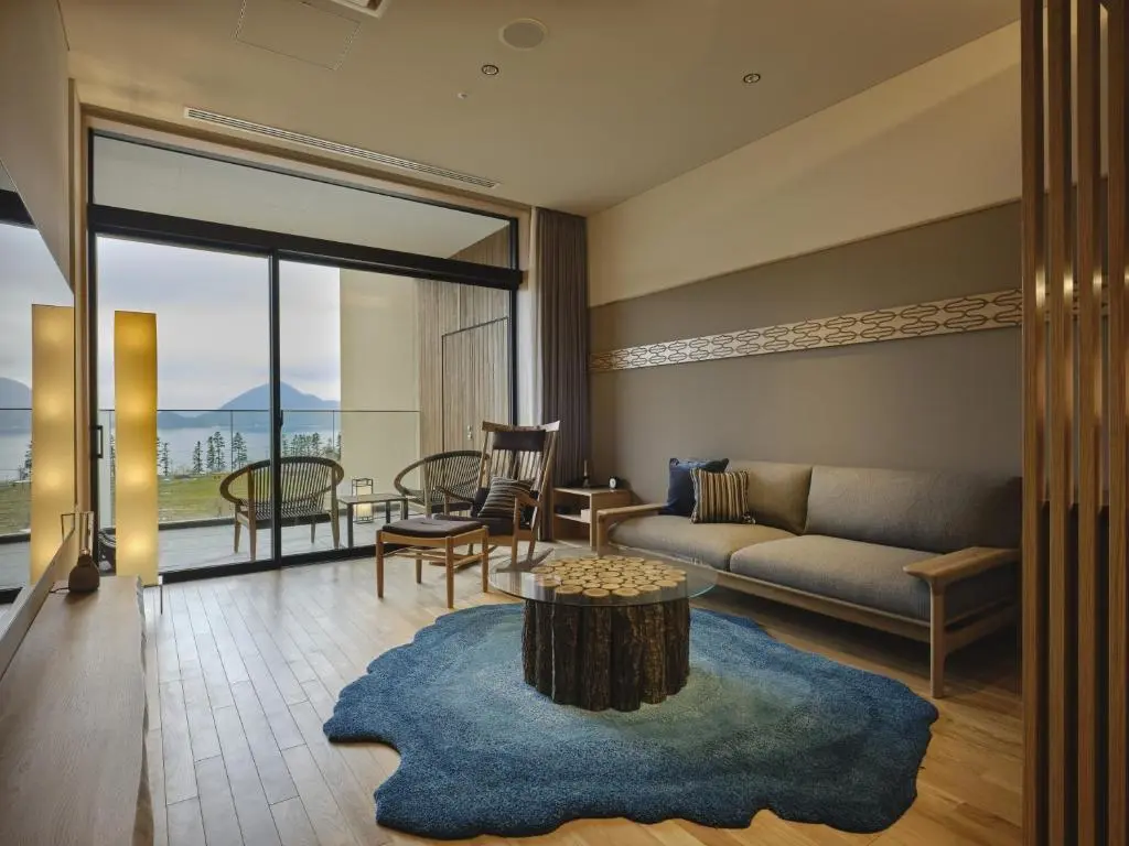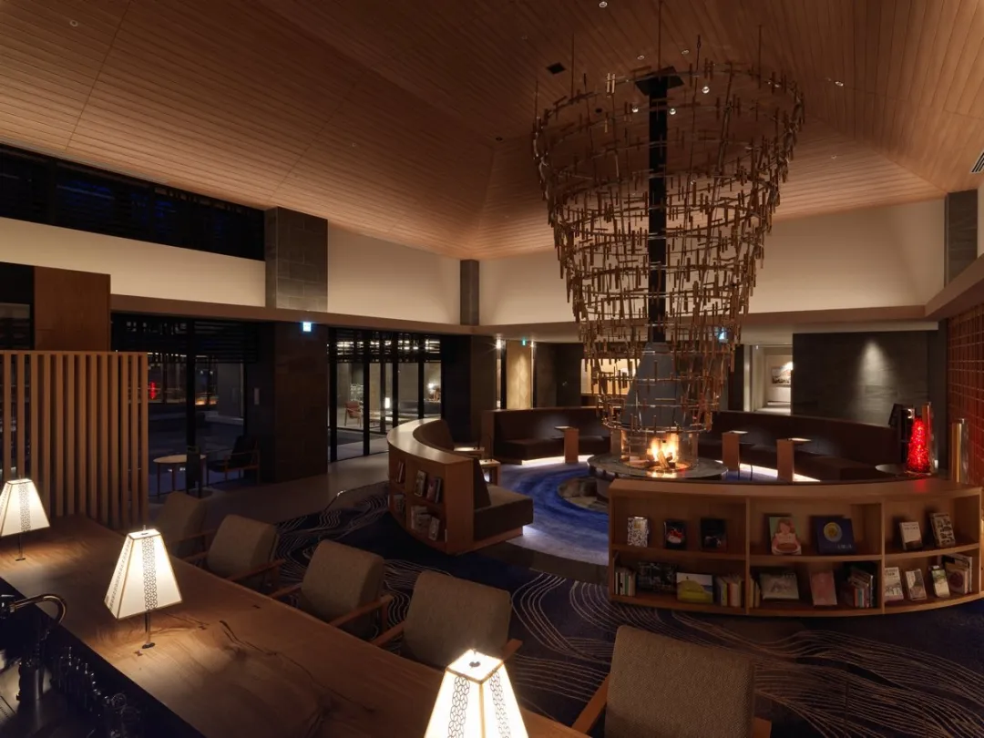 洸之謌位于可以眺望洞爷湖的山丘之上,靠近活火山有珠山,拥有绝佳视角。酒店入口处的“洸響”是一处造型优美的水庭,夜间景致更为绚丽。走进酒店中,便可以感受到浓郁的北国风情——设计中加入了北海道阿伊努文化元素,带给人们新鲜又特别的感受。