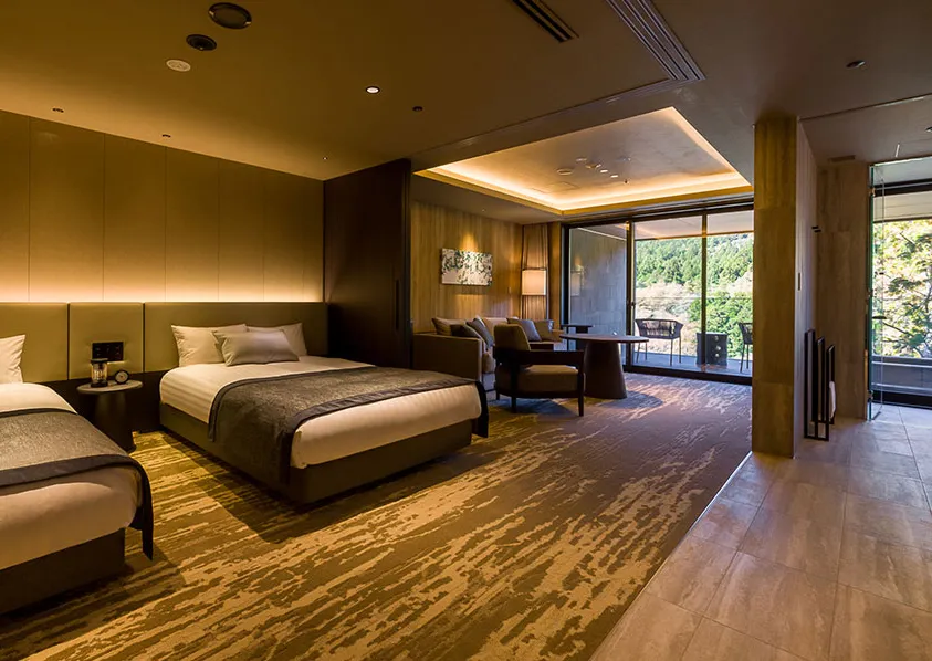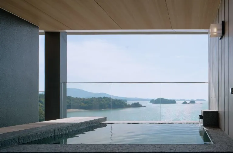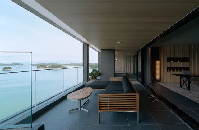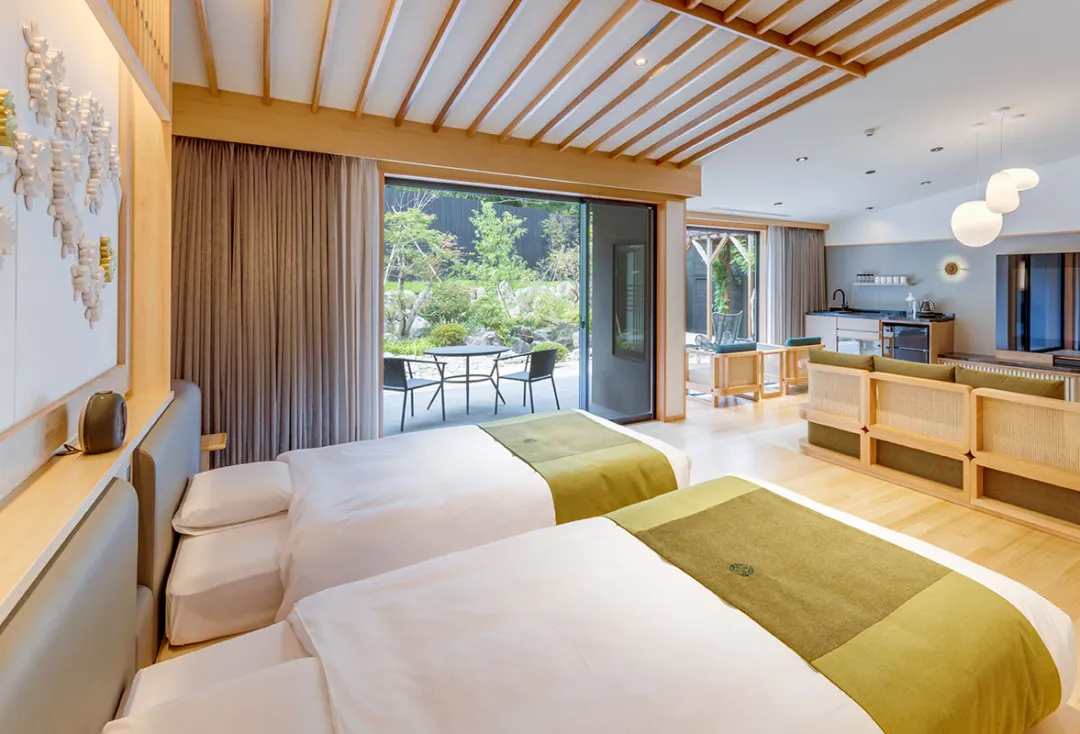 酒店仅有11间客室,共有三种房型可选,面积均在100平方米以上,皆为配备了松岛温泉的套房,无论是在卧室或是温泉处,放眼望去,便是天草松岛的碧海与星罗棋布的群岛交织的美景,幽静深邃,美不胜收。