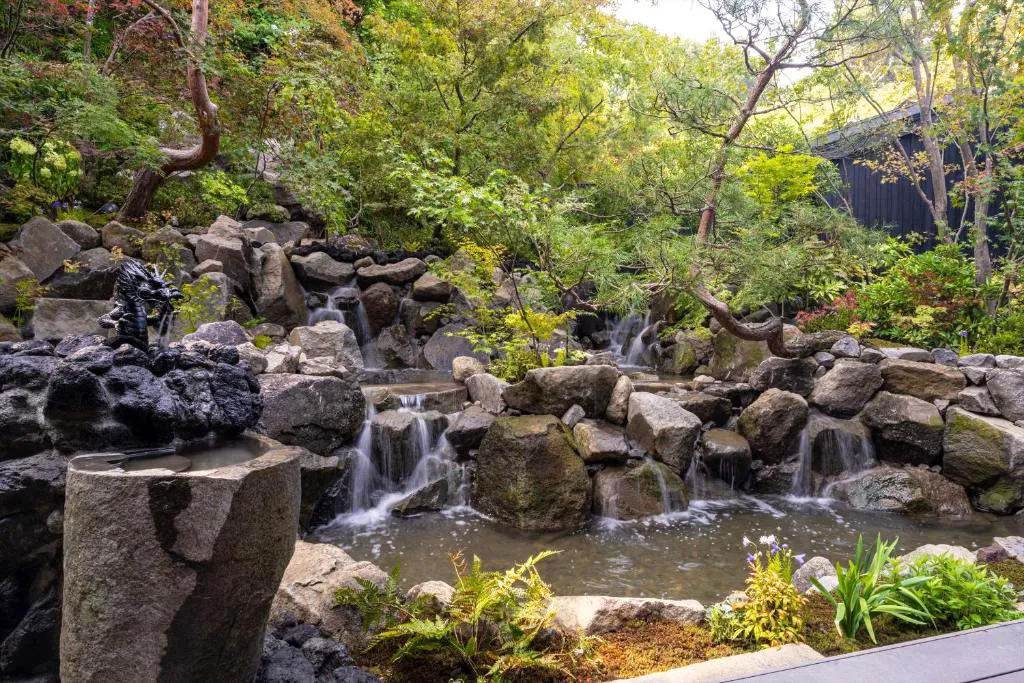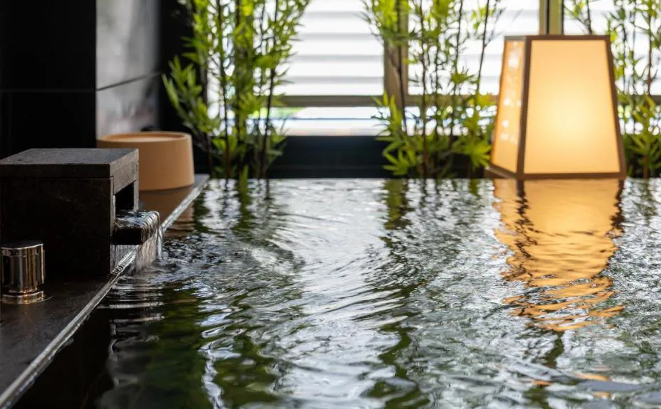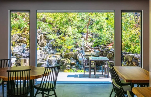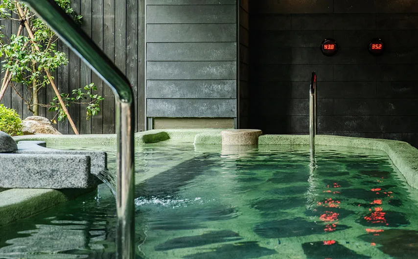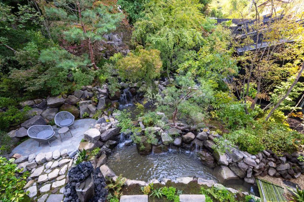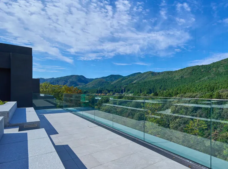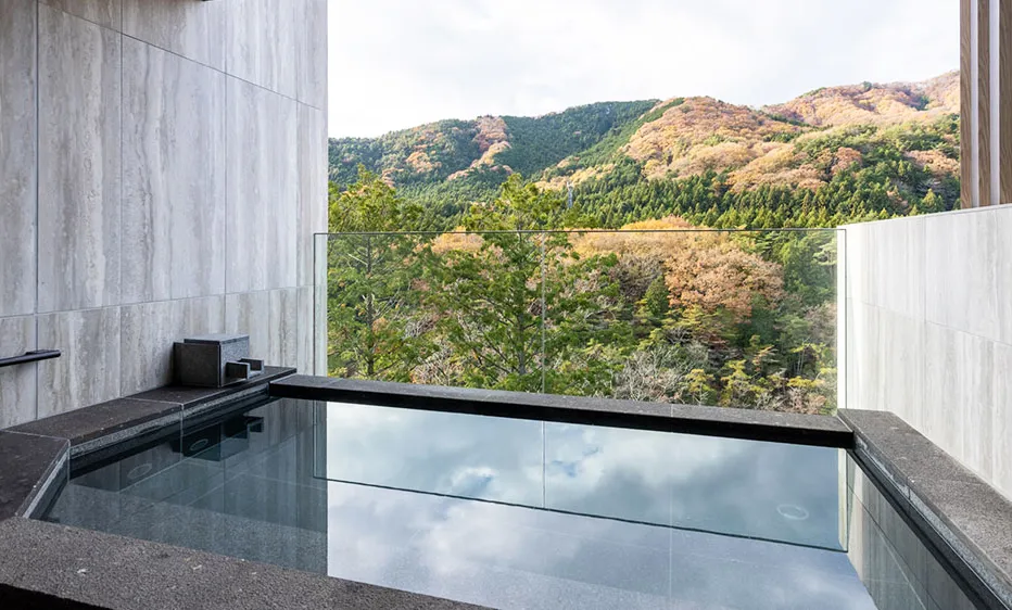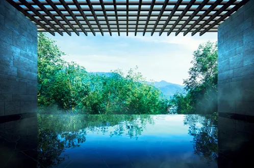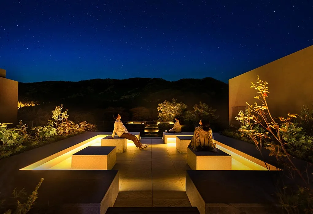 旅馆在一楼及六楼分别设有温泉大浴场及家族私汤,并可将溪谷的季节美景尽收眼底。在一楼庭园正中则是开阔的观景露台,举目可见群山叠翠,夜间还将点起篝火,亮起灯光,在朦胧山色环绕中,别有一种意境之美。