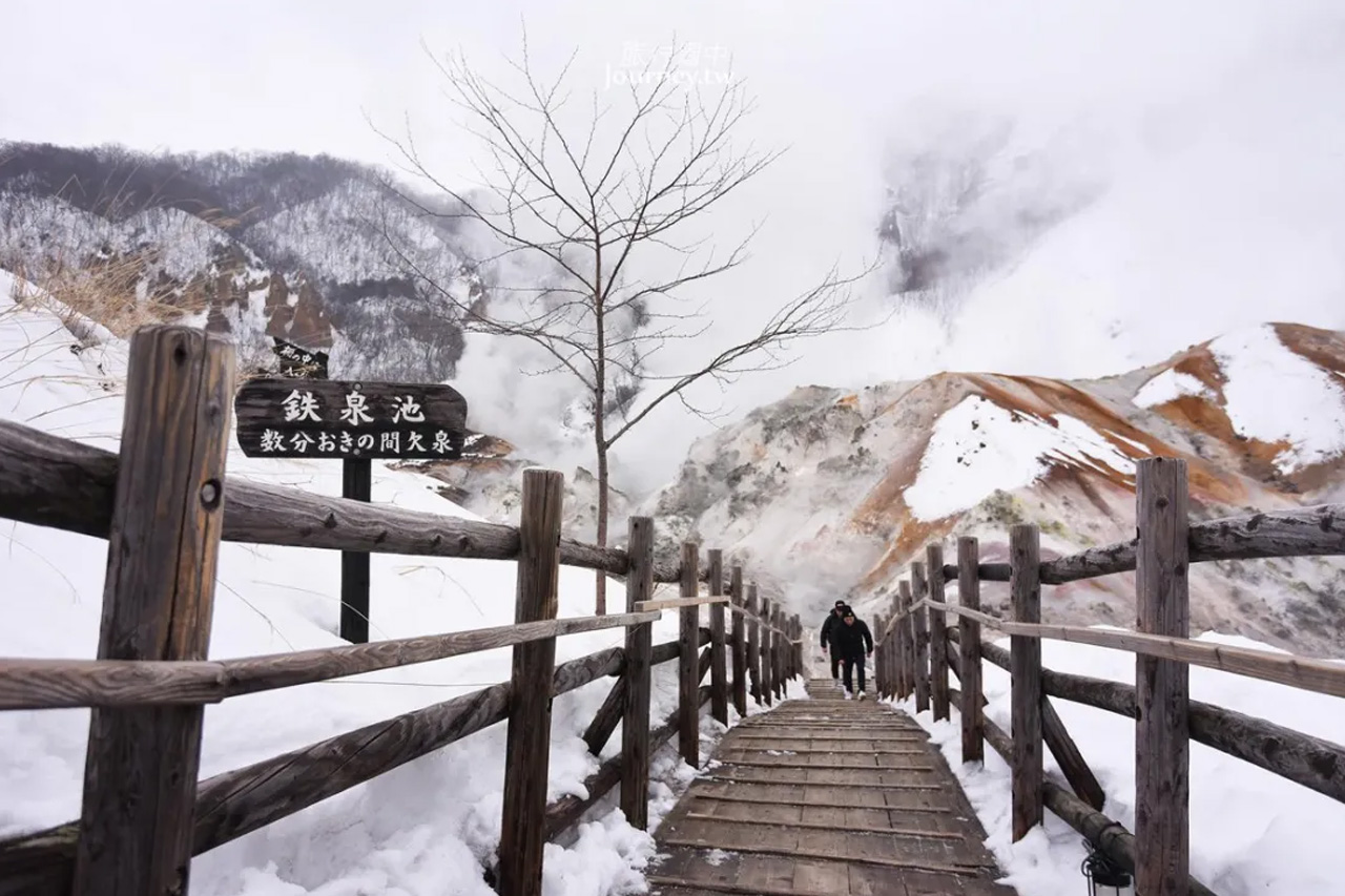 地狱谷是登别最具代表性的自然景观,形成于万年前的火山活动。裸露的岩层、喷涌的硫磺蒸汽与终年不散的白雾,构成极具震撼力的火山地貌。夜幕降临后,点点灯火引导游客步入谷地,白烟与岩壁在光影中若隐若现,宛如进入异世界。相比白天的壮阔,夜行更添神秘与幻想,是北海道冬季极具辨识度的体验之一。